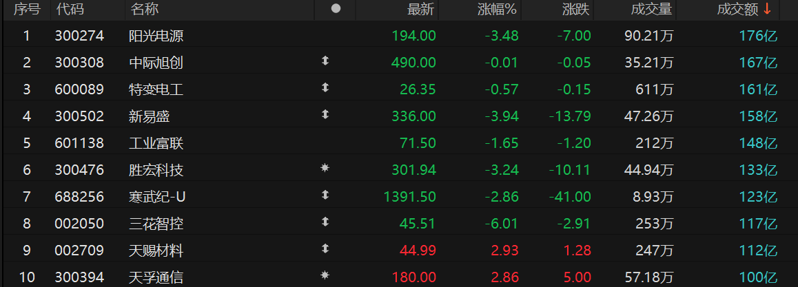 阳光电源成交额居首,为176亿元。其后是中际旭创、特变电工、新易盛、工业富联,成交额分别为167亿元、161亿元、158亿元、148亿元。