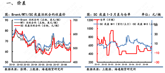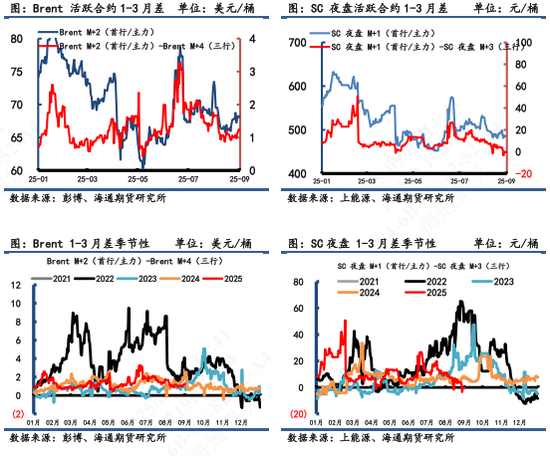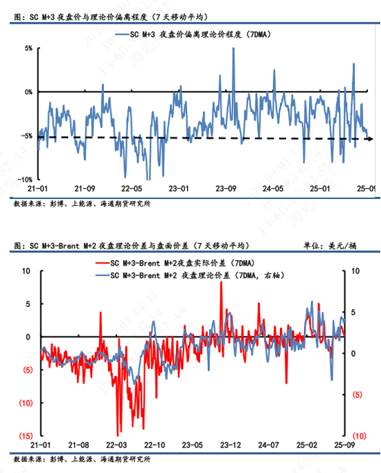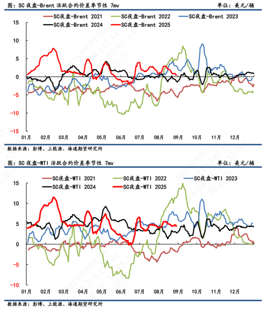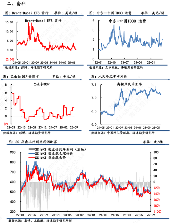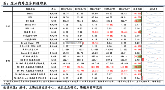 2)套利:①估值:8月29日凌晨2:30,Brent 2511盘面价为68.71美元/桶,SC 2512盘面价为484.3元/桶,测算SC 2512盘面理论价为527.2元/桶,当天盘面估值偏离程度-8.14%。从7天移动平均估值值中,以【-5%,0】为正常区间来看,目前处于低估值区间,有望形成估值 修复驱动。②利润:测算SC2512盘面到岸利润-40.10元/桶,折合-5.63美元/桶。③价差:SC2512-Brent2511盘面差为-0.32美元/桶,理论差5.31美元/桶,盘面价差低于理论价差。(注:本周Brent首行为2511;SC首行为2510;其中M代表时下9月)